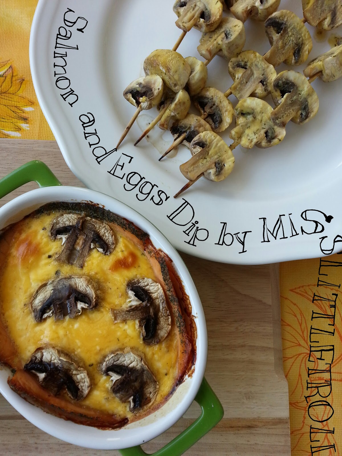 Hallo everyone! Have you ever invited your friends over for a BBQ to then find out that their wifes or husbands are vegetarian? No panic, here I have a cool solution to that! Champis skewers served with a Dip sauce. This One is actually prepared with Salmon but it can be easily adapted for your veg friends. Just scramble Eggs with soft cottage cheese, salt&pepper and put in oven for no more than 10min
